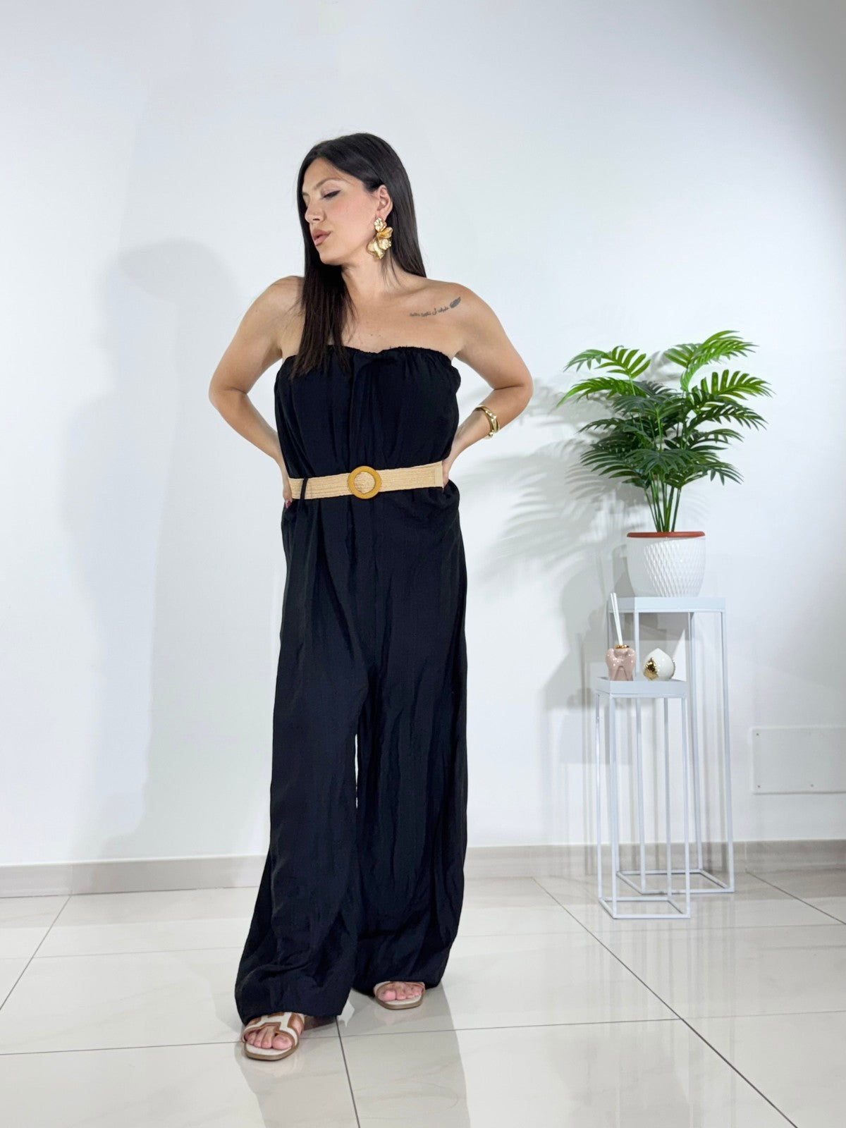 Tuta Stromboli – Spalle scoperte, tessuto leggero e pantalone palazzo